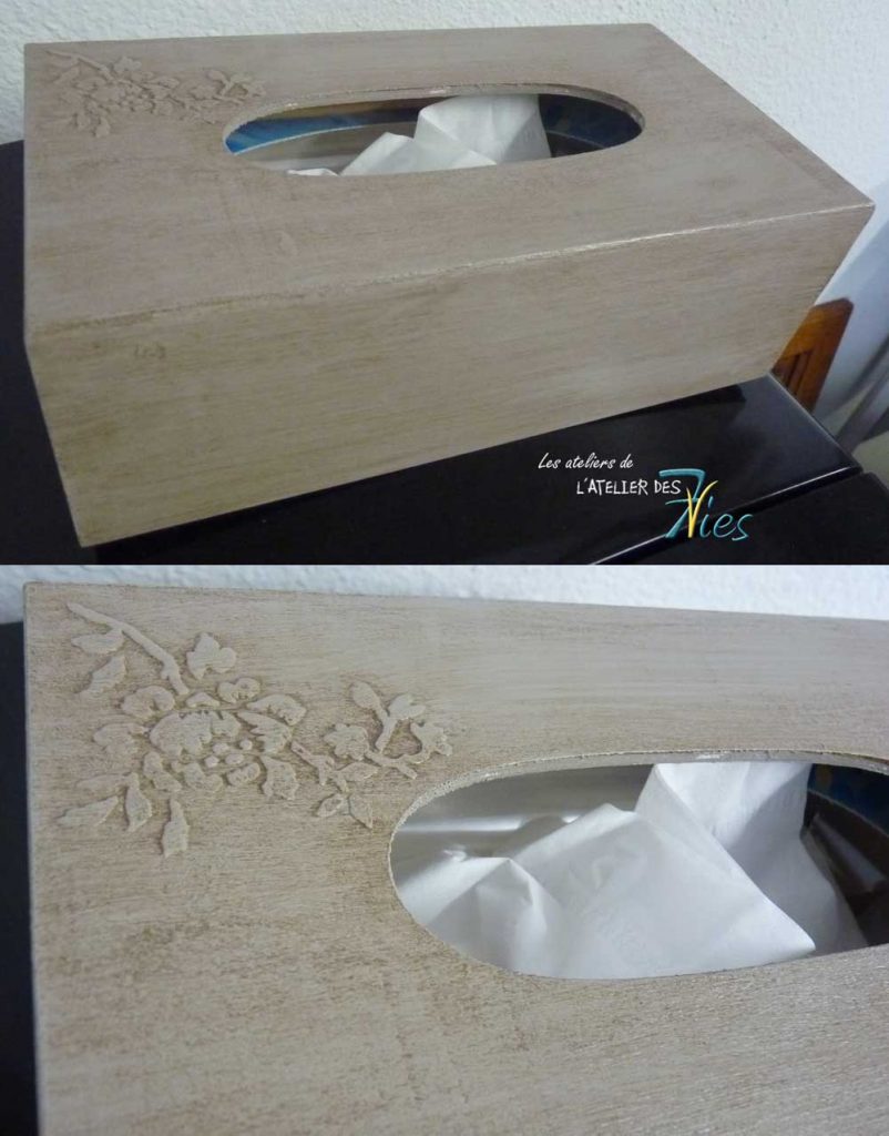 Voici leurs réalisations : pour tous une mise en peinture d’un support bois, puis pochoir en relief puis patine.