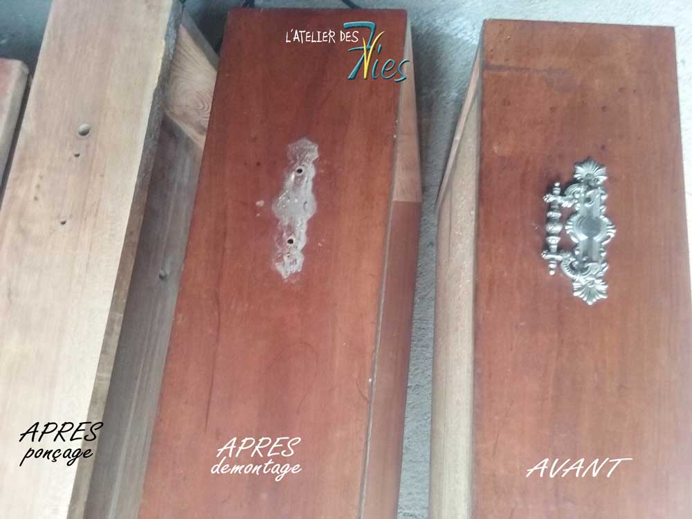 De la droite vers la gauche, le meuble a été démonté de ses ferrures puis nettoyé, poncé.